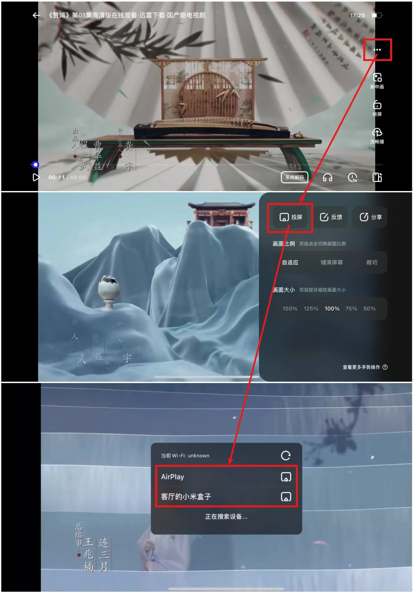 使用Safari浏览器,打开影视剧->开始播放->全屏->左下角投屏->等待搜寻到智能电视/电视盒子->选中,即可投屏。