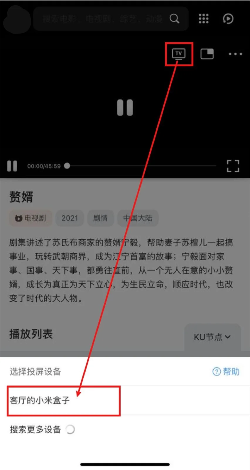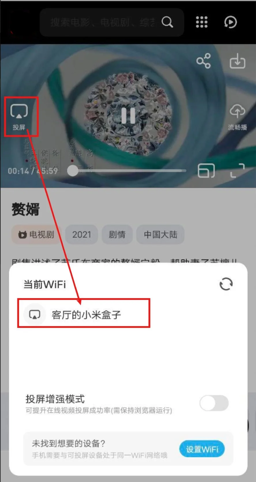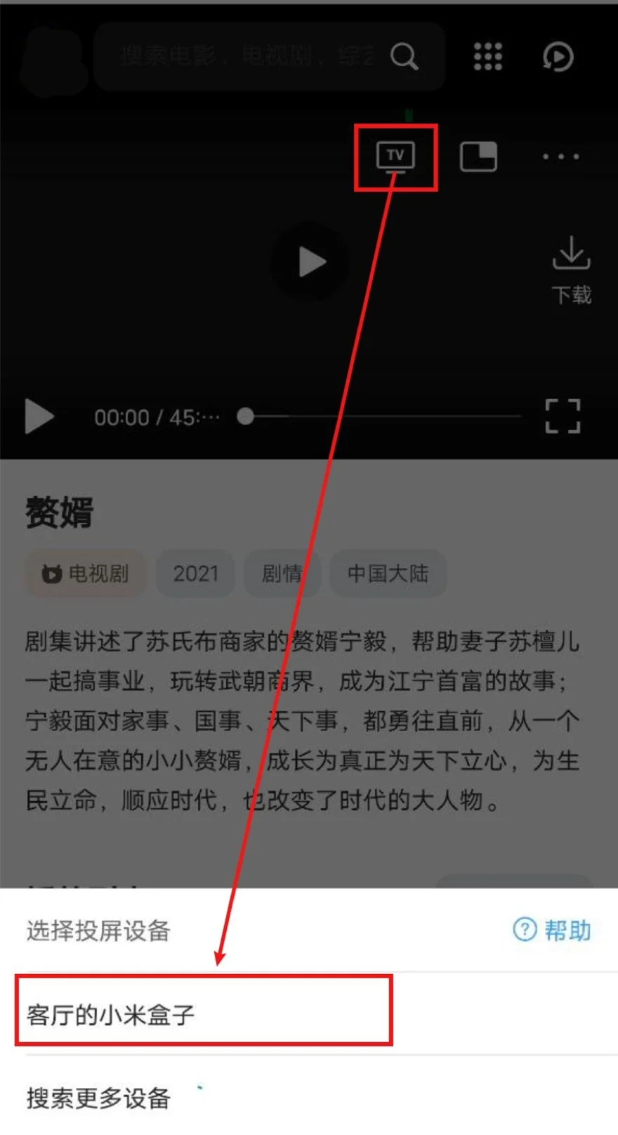 打开QQ浏览器(会接管网页播放器)->打开影视剧->播放视频->选中投屏图标->等待搜寻出智能电视/电视盒子->选中,即可投屏。